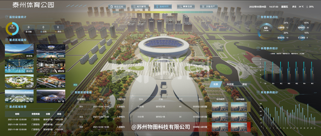 物图以客户需求为导向,通过数字孪生技术、实时渲染3D地理信息场景叠加各类数据,集合各业务子系统形成智慧场馆综合管理平台,为泰州体育中心打造一个现代化、智能化的运营管理系统,提升体育赛事的组织和运营效率,为运动员和观众提供更好的体验。